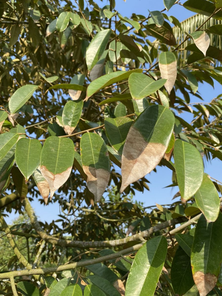 ► Song song đó, khi sử dụng thuốc tạo mầm chặn đọt sầu riêng nhà vườn phun quá nhiều thuốc chứa lân và kali, làm cho lá bị cứng và thô là một trong những nguyên nhân dẫn đến hiện tượng cháy lá sầu riêng.