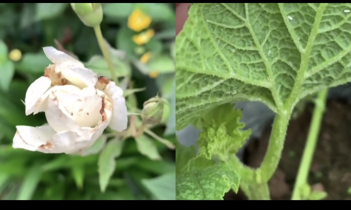 - Lá non bị biến dạng, xoăn lại, sức sống cây kém. Khi bị nặng chồi non nhú ra lập tức bị cháy đen, đầu và cuống hoa teo tóp lại.