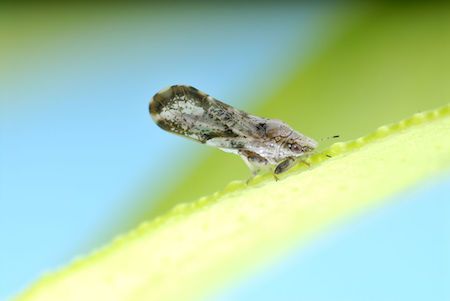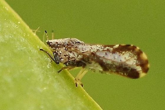 - Trưởng thành: Thân dài từ 2,5 - 3 mm, nâu xám, cánh có màu nâu đen ánh vàng, phần giữa cánh trong suốt, cánh dài có màu nâu xen kẽ vệt trắng chạy từ đầu đến cuối cánh, chân có màu xám nâu, lúc đậu cánh và bụng nhô cao hơn khỏi đầu. Đầu nhọn màu nâu nhạt. Mắt có màu đỏ. Râu đầu ngắn có 5 đốt, đốt cuối râu đầu có màu đen. Bụng con cái sắp đẻ có màu hồng.