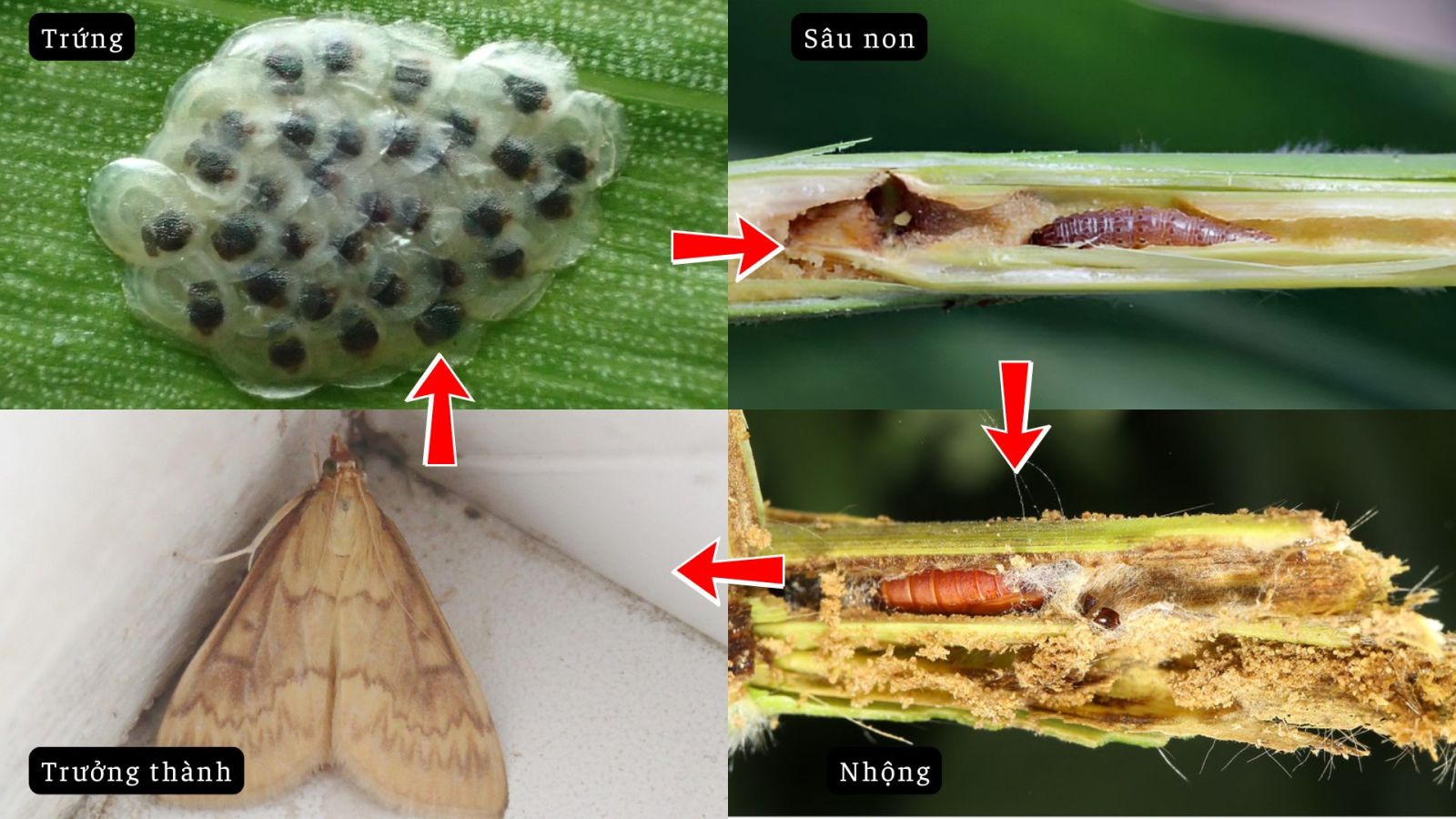 - Nhộng: Nhộng có màu nâu nhạt dạng thuôn dài nằm ở ngay đường đục trong thân cây hoặc trong bẹ lá, lõi bắp, lá bao.