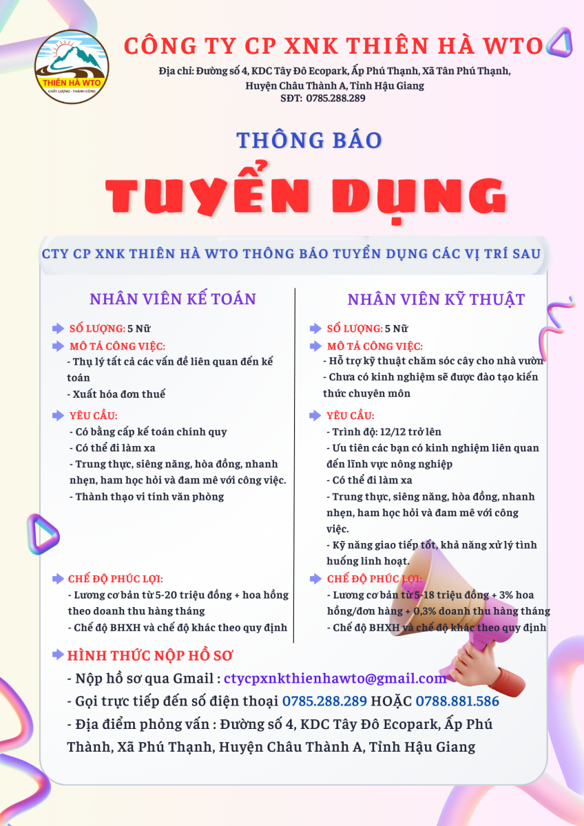 CÔNG TY CỔ PHẦN XUẤT NHẬP KHẨU THIÊN HÀ WTO thông báo tuyển dụng các vị trí sau: