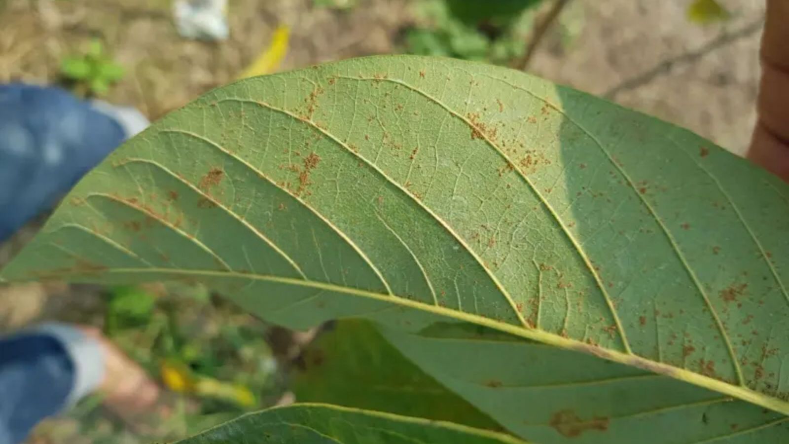 Triệu chứng gây hại trên lá: Bệnh thường xuất hiện trên những phần tán cao của cây, lúc đầu chỉ là những tổn thương nhỏ có màu nâu đỏ, sau đó lan dần ra bề mặt của cả hai mặt lá. Lá bị biến dạng, teo nhỏ và sau đó là rụng dần, bệnh có thể lây lan ra cuống lá và cành cây.