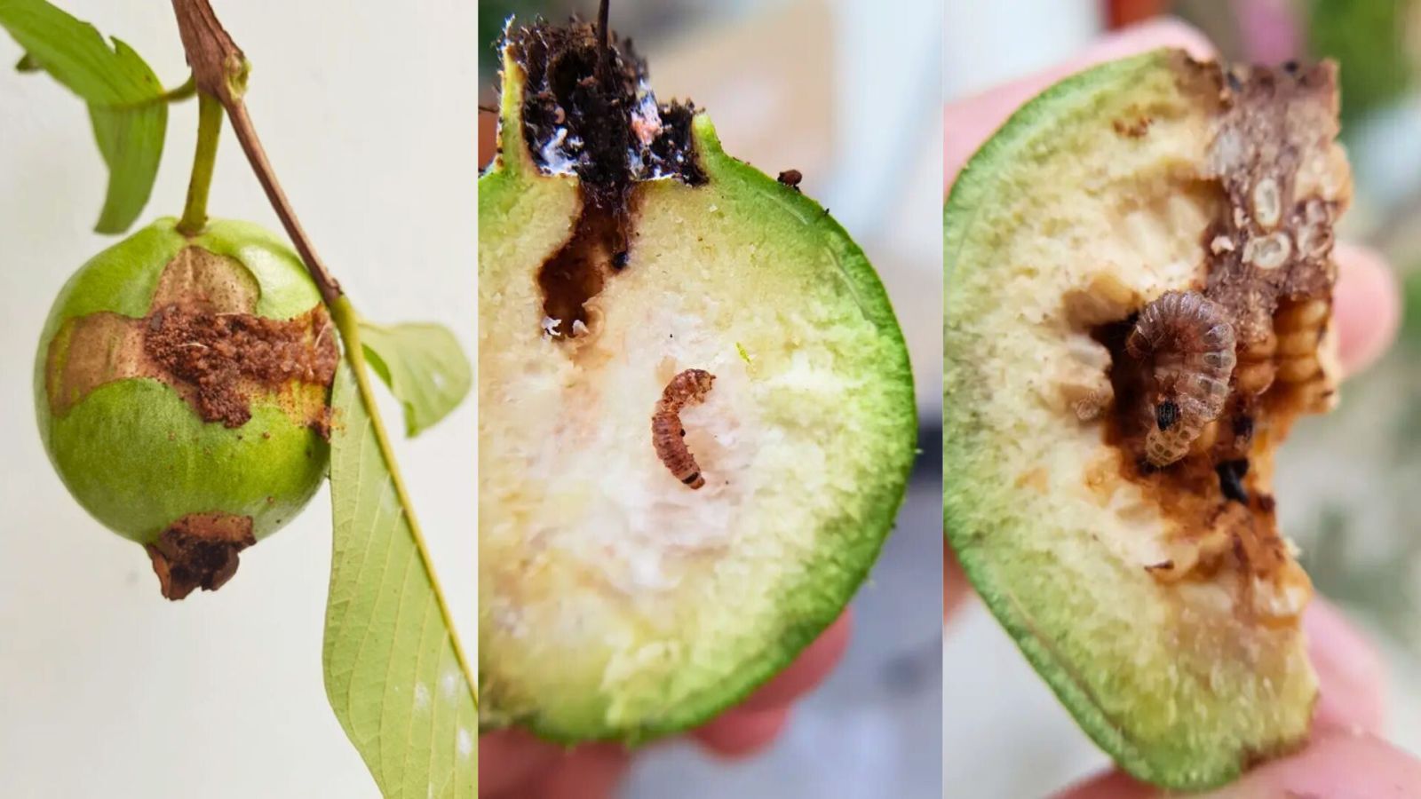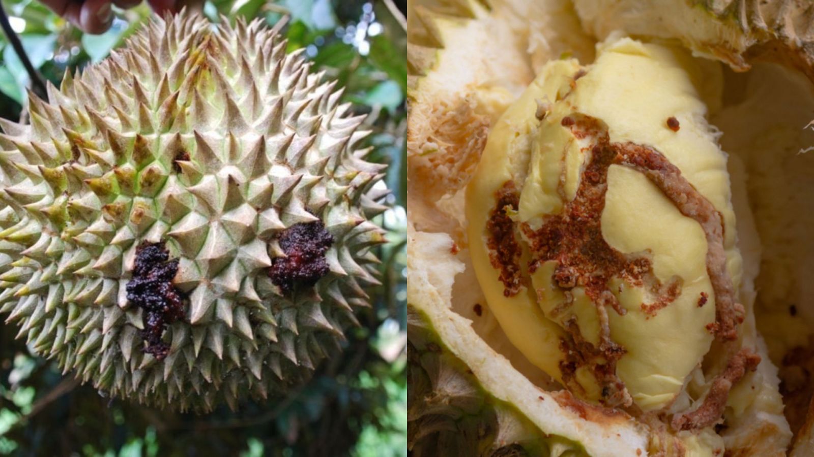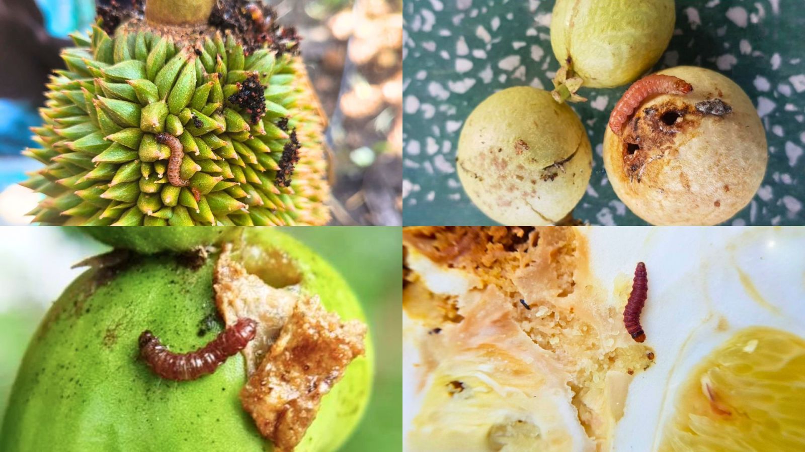 - Sâu tấn công để lại những lỗ đục trên trái. Khi gặp mưa hoặc độ ẩm không khí tăng cao hay sương đậm kéo dài sẽ tạo điều kiện thuận lợi cho nấm bệnh xâm nhập dẫn đến thối trái, thối luôn cả phần thịt bên trong trái.