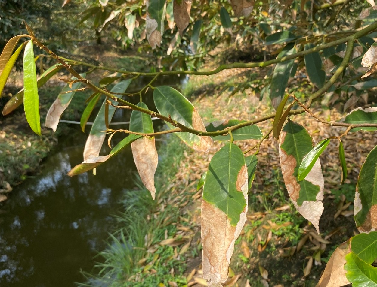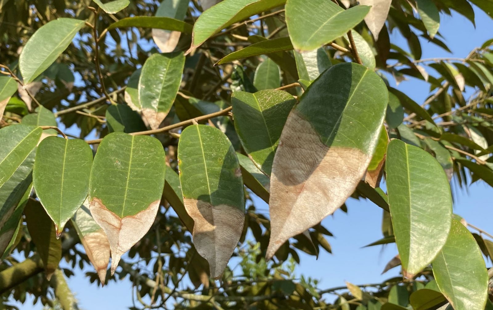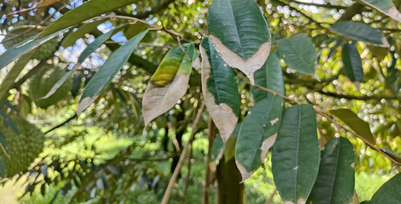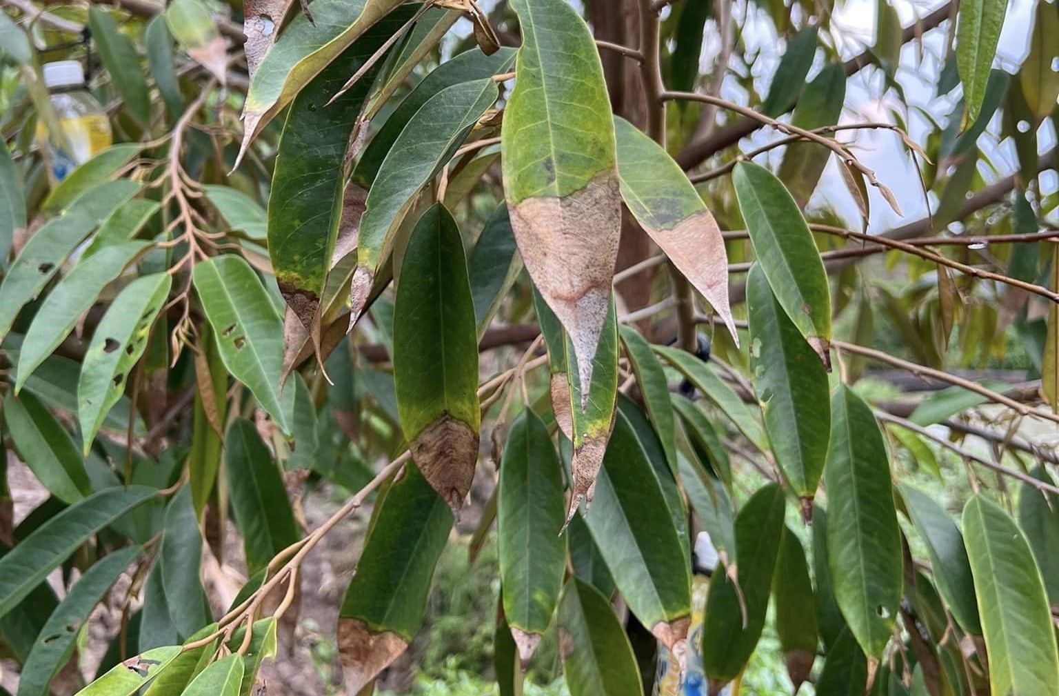 - Khi sử dụng thuốc tạo mầm chặn đọt sầu riêng nhà vườn phun quá nhiều thuốc chứa lân và kali, làm cho lá bị cứng và thô dẫn đến cháy lá thán thư.