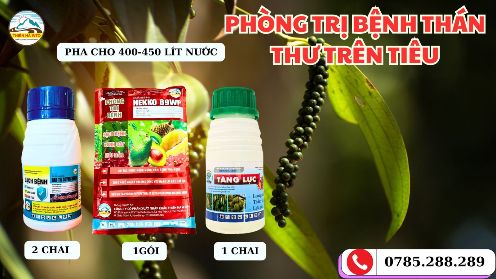 Tiến hành phun thuốc để phòng trừ bệnh thán thư trên tiêu. Bà con có thể sử dụng 2 chai thuốc SẠCH BỆNH kết hợp với 1 gói thuốc PHÒNG TRỊ BỆNH pha cho 400-450 lít nước để phòng trừ nấm bệnh thán thư.