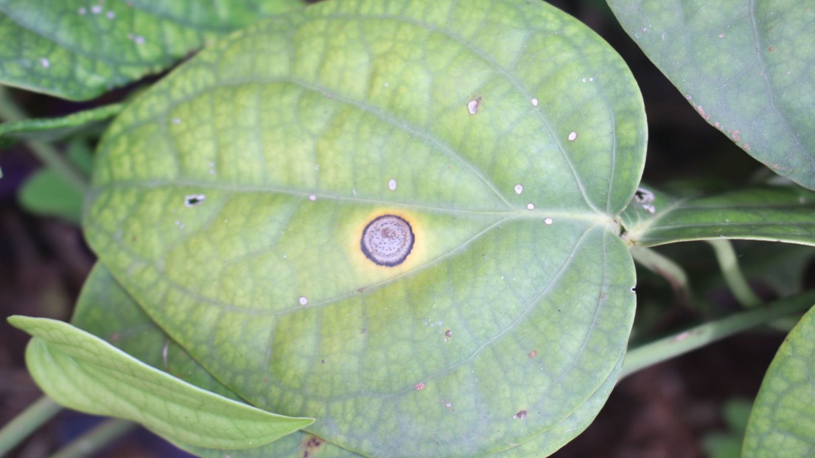 Trên lá: khi bị nấm bệnh tấn công, trên bề mặt của lá xuất hiện những đốm có màu vàng, sau đó chuyển sang màu nâu rồi hóa dần sang đen với nhiều hình dạng bất định. Xung quanh vết bệnh có vệch quầng màu vàng hoặc xám đen nhẹ. Vết bệnh thường xuất hiện ở chóp và mép lá hồ tiêu, sau lan dần vào phiến lá. Về sau vết bệnh có màu xám hay xám trắng, có những hình tròn đồng tâm bên trong vết bệnh. Vết bệnh có thể làm phân tách giữ phần mô lá bị bệnh và phần mô không bị bệnh rõ rệch. Lá bị bệnh nặng sẽ bị vàng, cháy và rụng.