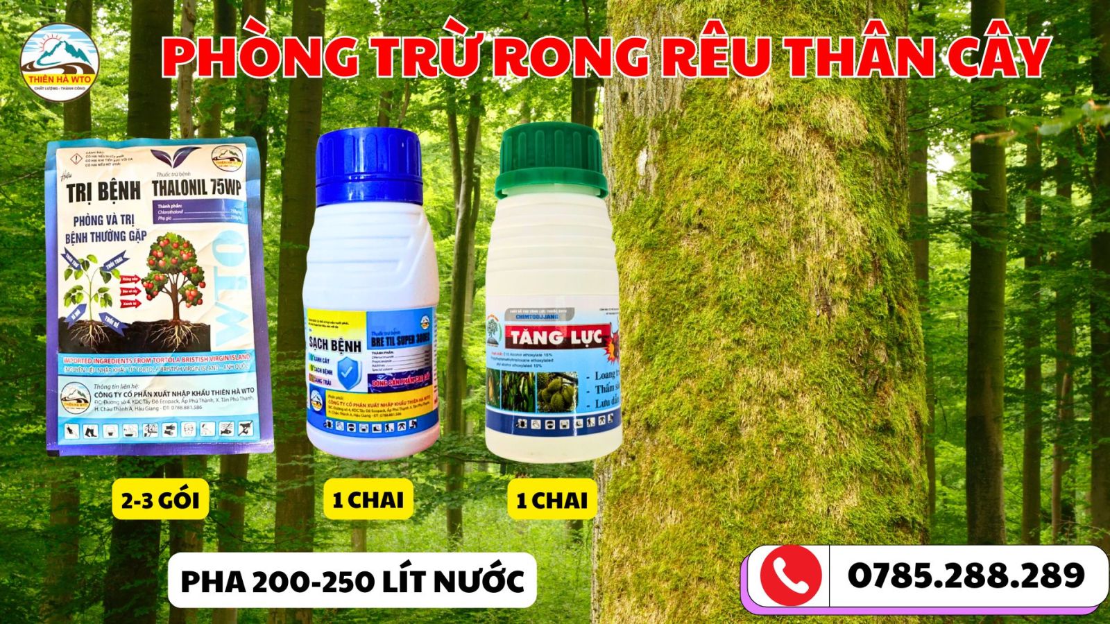 Quý bà con có thể sử dụng 2-3 gói thuốc TRỊ BỆNH kết hợp với 1 chai thuốc SẠCH BỆNH pha với 200-250 lít nước để giúp ngăn ngừa rong rêu bám lên các bộ phận của cây. Để việc phòng trừ rong rêu có hiệu quả hơn nhà vườn có thể kết hợp thêm với 1 chai THẤM SÂU để giúp cây nhanh chóng hấp thụ thuốc, hạn chế bị mưa rửa trôi và bốc hơi.