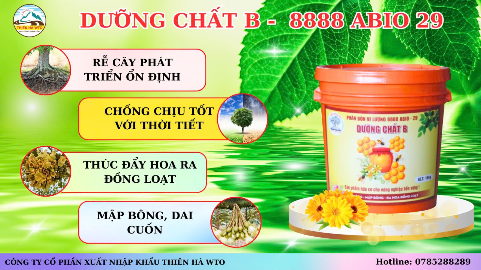Trong quá trình phát triển cây trồng cần được cung cấp đầy đủ chất dinh dưỡng thiết yếu để phát triển một cách toàn diện nhằm cung ứng cho nhu cầu năng suất và chất lượng, cây cần được cung cấp dinh dưỡng để ổn định và phát triển mạnh mẽ thì khả năng ra hoa đậu trái sẽ đạt được chất lượng cao đem lại hiệu quả kinh tế cao. Hôm nay THIÊN HÀ WTO xin trân trọng giới thiệu đến quý bà con sản phẩm DƯỠNG CHẤT B một sản phẩm hữu cơ cho nông nghiệp bền vững mời quý bà con cùng tìm hiểu rõ hơn qua bài viết hôm nay.