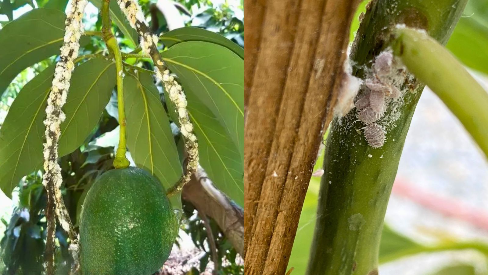 - Tại vị trí tập trung của rệp sáp hại bơ thường để lại một lớp sáp màu trắng làm ảnh hưởng đến khả năng quang hợp của lá.