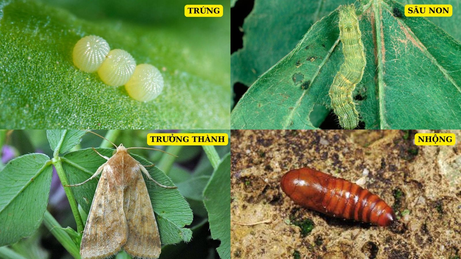 - Nhộng có màu nâu, dài từ 18-20mm, với hai gai song song ở cuối bụng. Sâu xanh bắt đầu hóa nhộng trong lớp đất sâu từ 5-10 cm.