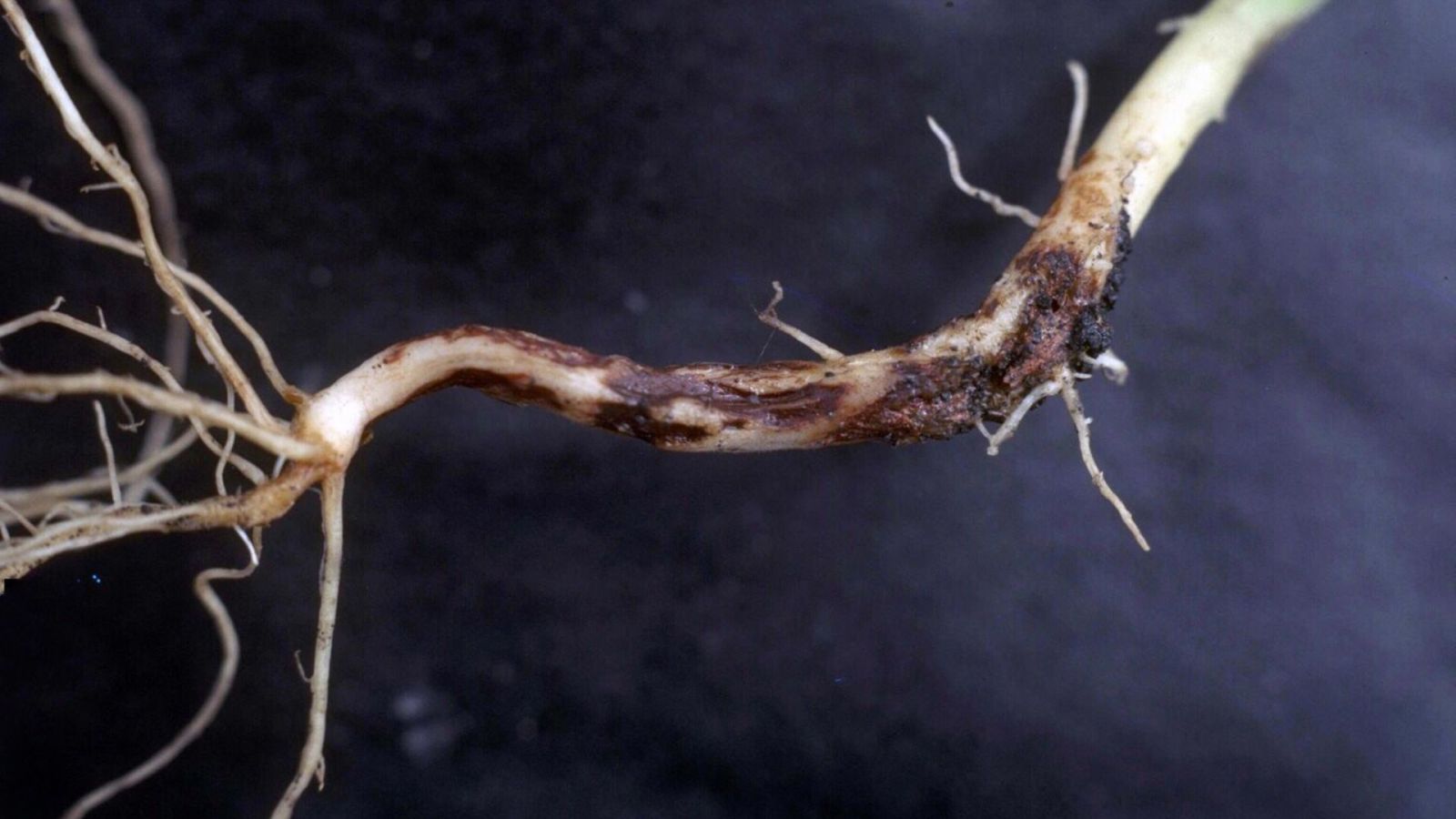 Bệnh thường phát sinh trong giai đoạn cây còn nhỏ, thường gặp nhất là ở giai đoạn cây con trong vườn ươm cho đến 1 tháng sau khi trồng. Vết bệnh ban đầu là những đốm đen ở cổ rễ. Sau đó những vết bệnh này lan rộng ra cổ rễ gần mặt đất, khiến rễ teo tóp lại. Rễ sẽ chuyển sang màu nâu và có dấu hiệu bị thối.