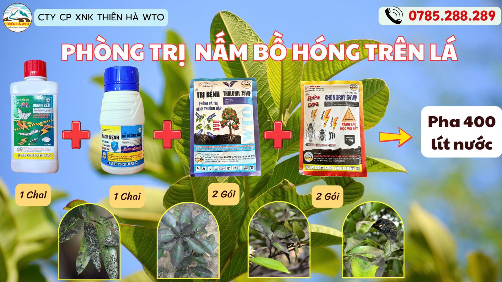 1 chai SÂU E SINH HỌC + 1 chai SẠCH BỆNH + 2 gói TRỊ BỆNH + 2 gói RẦY SỐ 1 pha cho 400 lít nước để phun giúp phòng trừ nấm bồ hóng đeo bám trên lá.