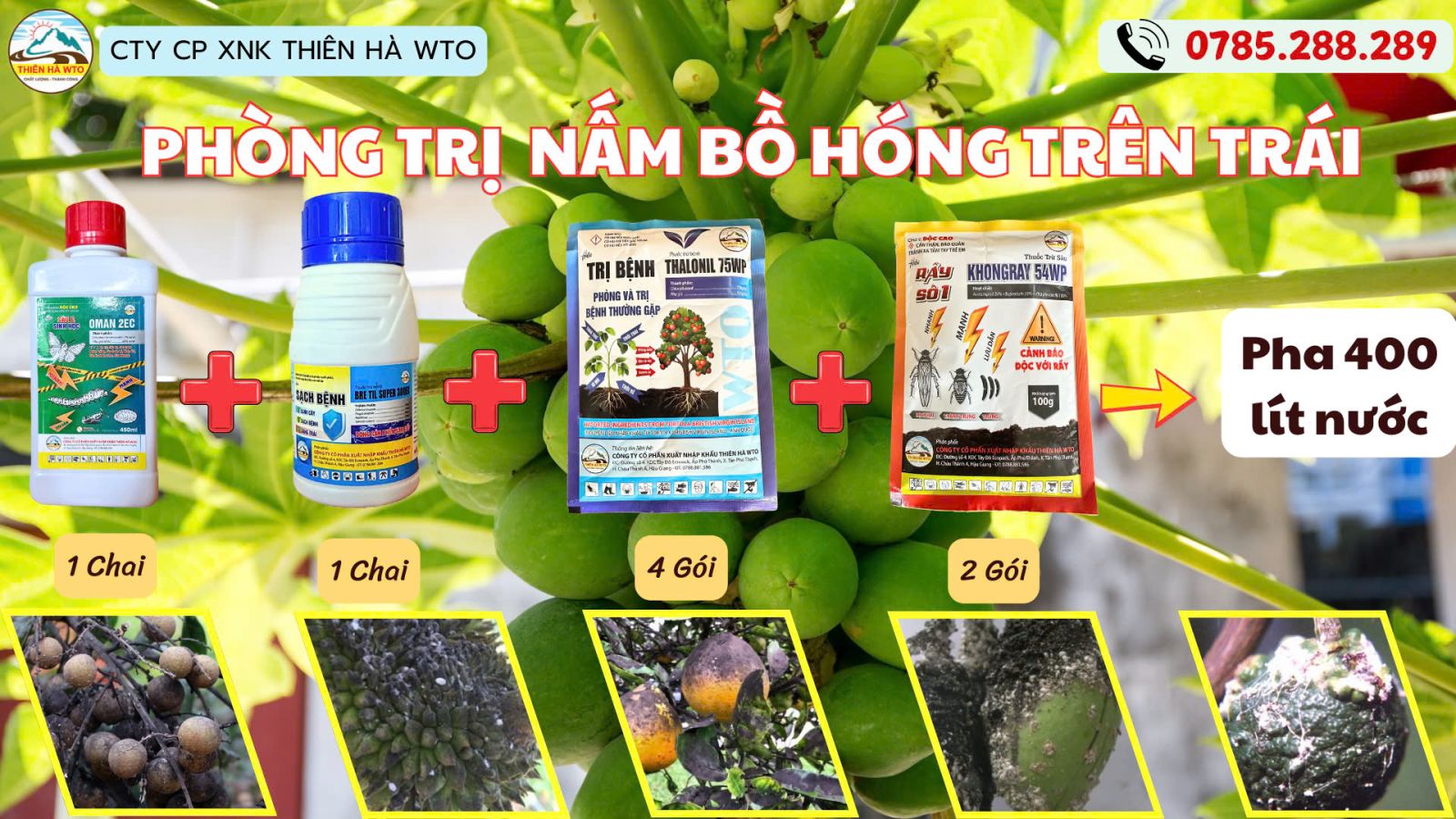 1 chai SÂU E SINH HỌC + 1 chai SẠCH BỆNH + 4 gói TRỊ BỆNH + 2 gói RẦY SỐ 1 pha cho 400 lít nước để phun giúp phòng trừ nấm bồ hóng đeo bám trên trái.