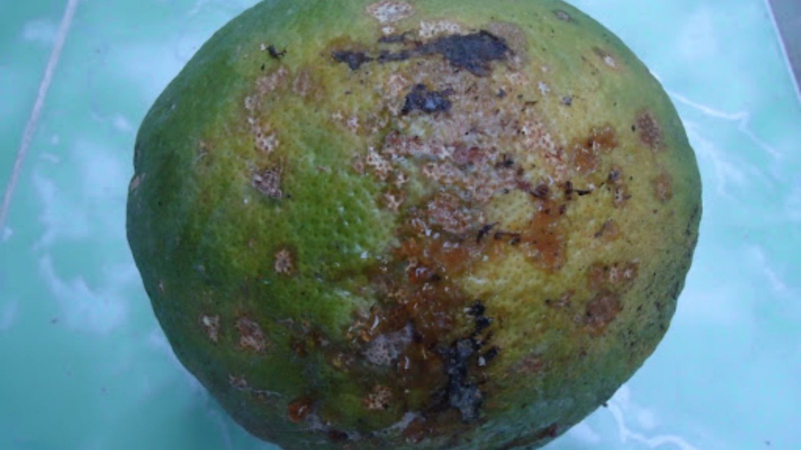 - Trên trái: Bệnh gây hại từ trái già đến giai đoạn sau thu hoạch. Trên trái bệnh, xuất hiện những đốm nhỏ tròn, màu vàng nhạt trên vỏ trái, vết bệnh hơi lõm vào vỏ. Nơi vết bệnh vỏ bị khô sần sùi, bệnh càng nặng vết bệnh càng lan rộng, chuyển sang màu nâu đậm, đôi khi bị nứt ra ngay vết bệnh và có nhựa chảy ra trong điều kiện ẩm độ cao. Trái có thể bị thối. Nấm bệnh có thể gây hại trên cành non làm cành bị héo khô.