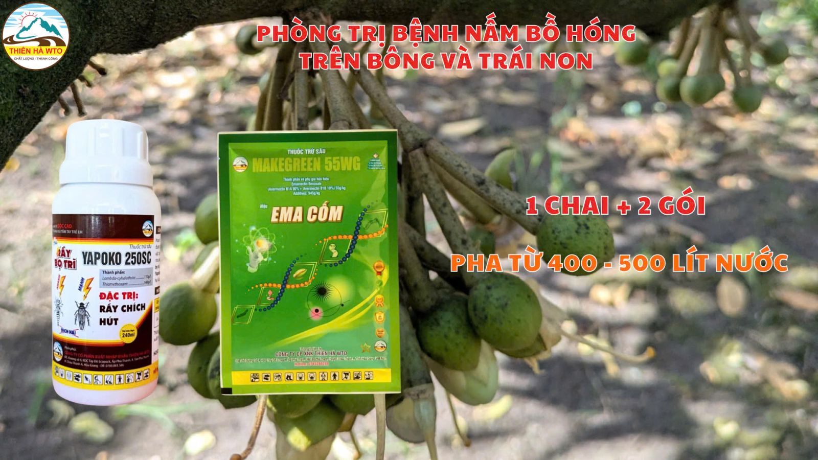 Bà con có thể sử dụng thuốc 1 CHAI RẦY BỌ TRĨ kết hợp với 2 GÓI EMA CỐM pha cho 400 - 400 lít nước để phòng trị nấm bồ hóng trên bông và trái non trên sầu riêng.