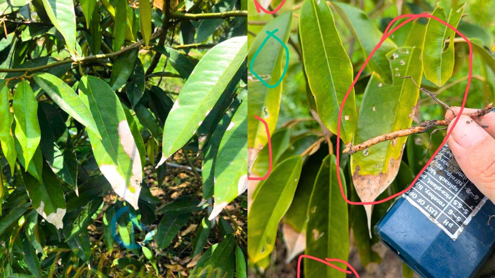 - Khi sử dụng thuốc tạo mầm chặn đọt sầu riêng nhà vườn phun quá nhiều thuốc chứa lân và kali, làm cho lá bị cứng và thô dẫn đến cháy lá thán thư.