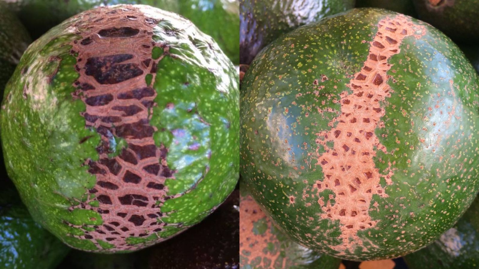 - Triệu chứng gây hại trên quả: Trên vỏ quả xuất hiện những vết bệnh hình bầu dục có màu nâu hoặc nâu tím, hơi gồ ra ngoài phía vỏ quả và dần lan rộng ra. Đối với những quả già, vết bệnh sẽ xuất hiện xung quanh quả và có khả năng liên kết với nhau khiến trái bị thâm đen. Khi quả bị xâm nhiễm nặng, trung tâm vết bệnh xuất hiện các vết nứt và tạo thành mảng trông như vết ghẻ, vỏ bị sần sùi. Chất lượng quả không bị ảnh hưởng quá nhiều nhưng giá trị thẩm mỹ bị mất đi.