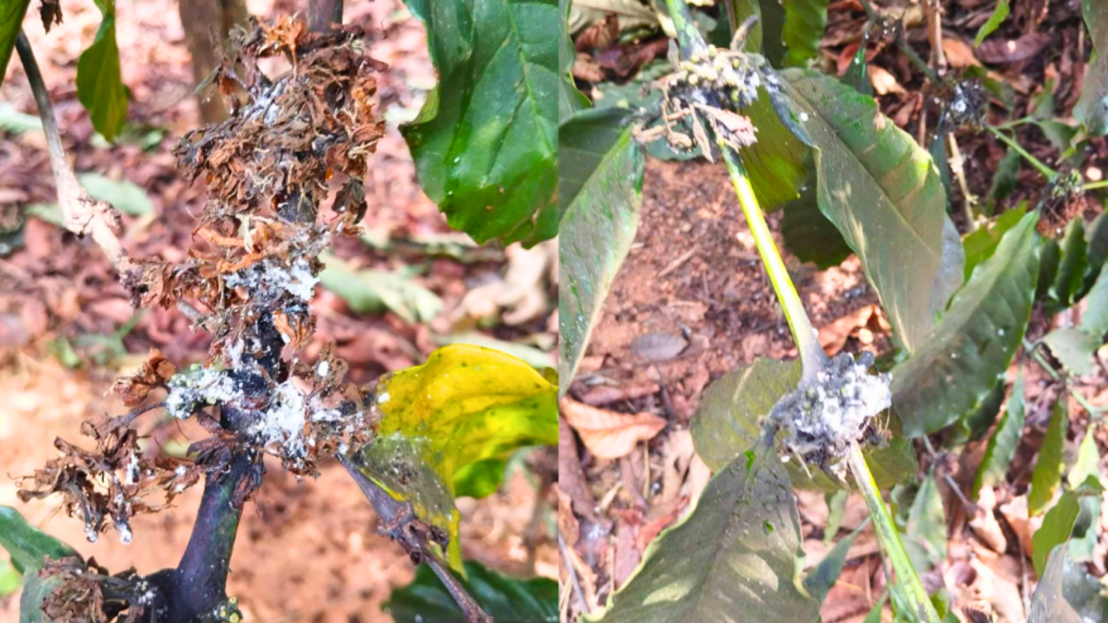 + Rệp sáp hại rễ cà phê: rệp thường sống trong đất, bám xung quanh rễ, dùng miệng chích hút nhựa cây để lấy chất dinh dưỡng. Trong quá sinh trưởng chúng thường tiết ra một lớp sáp không thấm nước phủ quanh rễ cây, làm cho cây không lấy được nước và chất dinh dưỡng, cây sẽ vàng héo, suy kiệt rồi chết. Các vết thương do rệp chích hút ở phần cổ rễ, khi gặp điều kiện thuận lợi, rệp sáp kết hợp với nấm gây hại bao quanh rễ cây làm cho rễ bị hư và gây bệnh thối rễ.