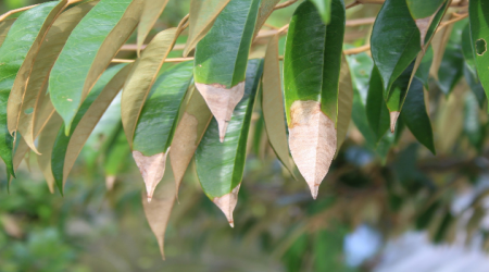Bệnh cháy lá thán thư gây hại chủ yếu trên lá của cây, làm cháy lá, khô lá, khi bệnh nặng có thể gây rụng lá, trơ cành từ đó làm giảm khả năng quang hợp của cây dẫn đến suy cây, chết cây